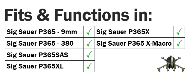 - Funciona con Sig Sauer P365, Sig Sauer P365 380, Sig Sauer P365SAS, Sig Sauer P365XL, Sig Sauer P365X, Sig Sauer P365 X-Macro y P365 AXG.