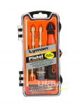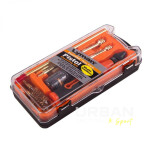 El kit de limpieza cubre los calibres 380 Auto, 9 mm Luger, 38 Special, 357 Magnum, 40 S&W, 45 ACP y 45 calibres Colt. El mango de aluminio mecanizado cuenta con un punto de fijacion giratorio para la varilla, que permite que la varilla gire y siga el estriado en el cañon. Todos los componentes estan empacados en un practico maletin de plástico.